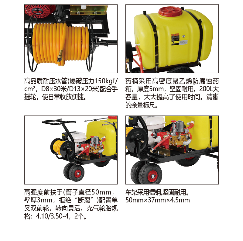 高密度聚乙烯防腐蝕藥箱,藥箱上配有刻度藥量顯示,及時掌握藥液噴灑情況;靈活可轉動的前扶手設計,轉向靈活;單叉雙前輪設計,前輪直徑255mm;雙管雙槍:高壓槍,霧化槍各1套, 高壓水管:D8×30m ,D13×20m