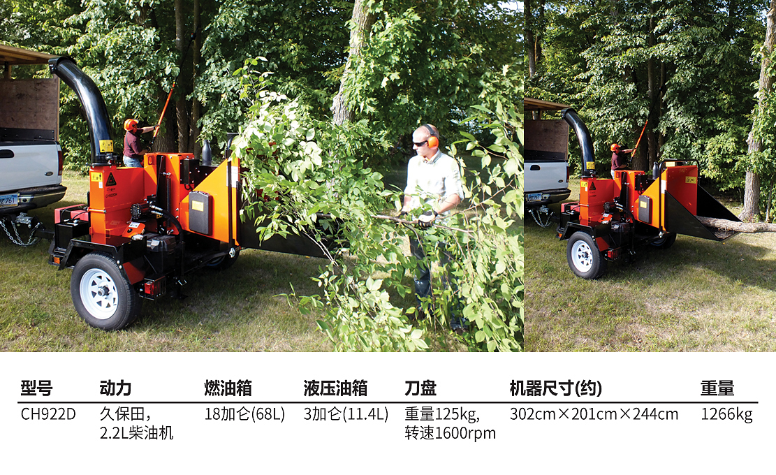 老熊(BEARCAT)品牌樹枝粉碎機(jī),配置久保田2.2L柴油機(jī),動(dòng)力更強(qiáng)勁,最大可切削直徑23cm樹枝;