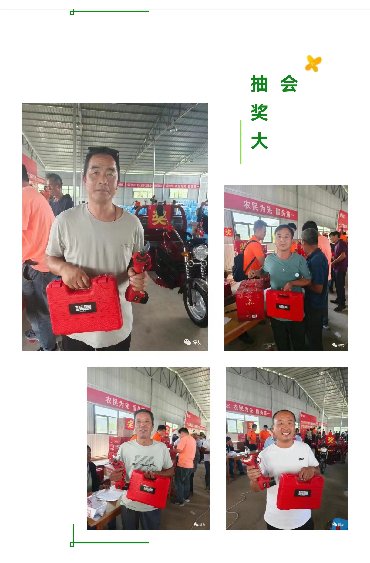 西安綠友園林機械有限公司寶雞分公司攜手某公社分別于8月24日和9月3日舉辦助力鄉(xiāng)村振興項目千人抽獎大會。每場次參會人員均達千余人,綠友公司的格林曼電動修枝剪作為獎品,廣受農戶好評。