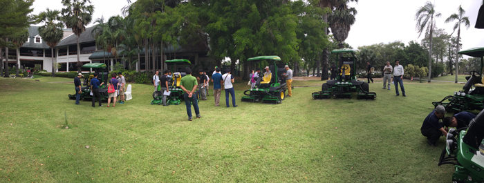 三天的培訓(xùn),時間安排緊湊有序,每天早晨七點準(zhǔn)時乘車出發(fā)去培訓(xùn)地點。前兩天培訓(xùn)安排在Lakewood高爾夫球場,最后一天的服務(wù)培訓(xùn)則安排在迪爾培訓(xùn)中心。首先從A系列最先進(jìn)技術(shù)Tech-control系統(tǒng)開始模擬操作學(xué)習(xí),通過顯示屏操控、設(shè)定、了解整車的運(yùn)行、剪草、維修、診斷等功能。Tech-control可視界面,具備指尖控制功能,不僅有助于實現(xiàn)出色的剪草效果,還可提高機(jī)器的工作效率。然后我們分組圍繞機(jī)器,進(jìn)行最直觀的實機(jī)學(xué)習(xí)和討論,在輔導(dǎo)老師的提示下,識別并列出每款A(yù)系列機(jī)器的新增功能、改進(jìn)及變化之處。之后老師通過一張張機(jī)器部位卡片和實際部件,清晰明了地講解每個機(jī)型的每個改進(jìn)部位,不僅讓銷售人員們對機(jī)器的部件有更加清楚地認(rèn)知,而且對部件的位置、形狀和區(qū)別,都有了深刻的印象,值得我們學(xué)習(xí)借鑒。最后根據(jù)這兩天的學(xué)習(xí),每個人都親自上車實機(jī)演示,上車前設(shè)置好剪草、運(yùn)輸、轉(zhuǎn)彎速度,手指輕按Tech-control操作平臺按鈕,即可感受自動巡航功能帶來的前所未有的操作員感受。通過課堂理論的學(xué)習(xí),以及室外場地的實機(jī)操作,使我們對A系列的新產(chǎn)品了解的更加透徹。在總結(jié)會上,老師準(zhǔn)備了很多A系列新功能的小標(biāo)題,通過游戲傳球的方式,讓大家利用小標(biāo)題展開話題進(jìn)行講解,課堂氣氛生動活潑,學(xué)員參與話題積極踴躍,而李國強(qiáng)對7200A在球場意外停機(jī)處理辦法的細(xì)致全面的講解,贏得了學(xué)員們熱烈的掌聲。